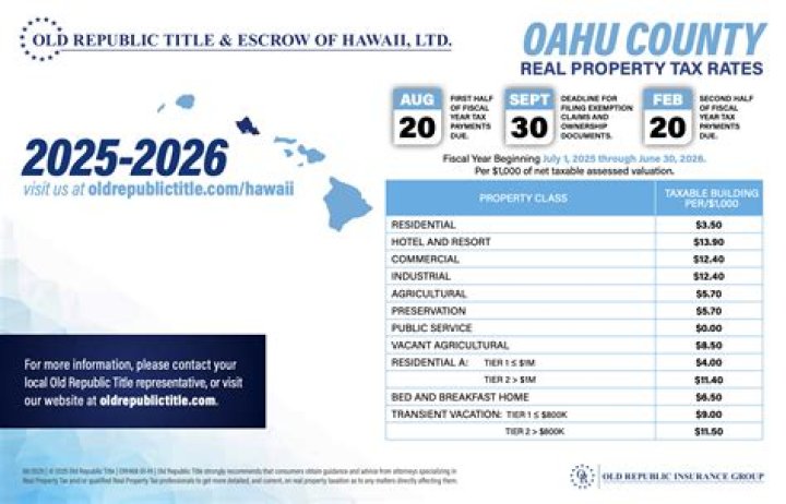 (1) Residential: 0.35% of assessed value (or $3.50 per $1000 of the net taxable real property value). This July 1, 2021 through June 30, 2022 (fiscal year 2021) rate applies to homes where the owner lives as their primary residence and to homes with an assessed value of less than $1,000,000.How are property taxes paid in Hawaii?