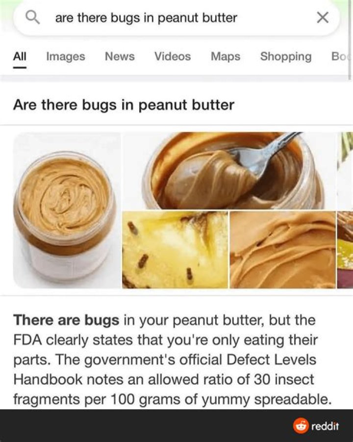 The government's official Defect Levels Handbook notes an allowed ratio of 30 insect fragments per 100 grams of yummy spreadable. That amounts to approximately 238 fragments in an average (28-ounce) jar of peanut butter.Why does peanut butter have bugs?