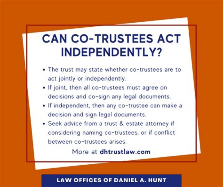 Can a co-trustee act alone? Co-trustees must be in agreement (either unanimously or by the majority) when making decisions unless the trust agreement expressly allows one co-trustee to act independently.