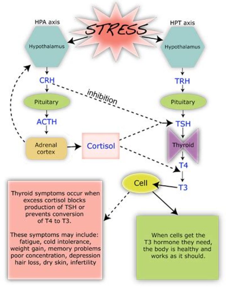 "Stress increases production of the hormone cortisol, which is produced by the adrenal glands. Cortisol can inhibit secretion of TSH (thyroid stimulating hormone) from the pituitary gland, leading to partial suppression of thyroxine, the main hormone produced by the thyroid gland," Dr. Guandalini explains.