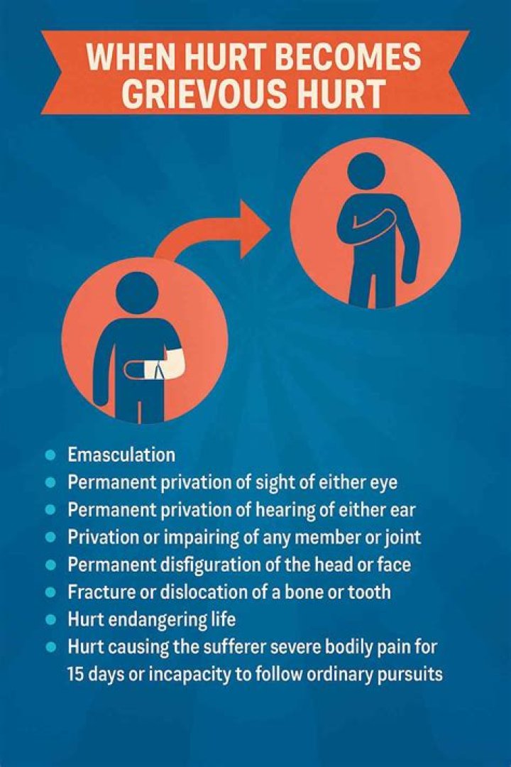 Section 319 defines simple hurt as whoever causes bodily injury, pain, sickness, or disability to another person by an act; such conduct is termed simple hurt. Section 320 defines grievous hurt as a hurt that is more than a little causing harm as defined in section 95 of the IPC and less than culpable homicide.Hurt and Grievous Hurt - Indian Penal Code