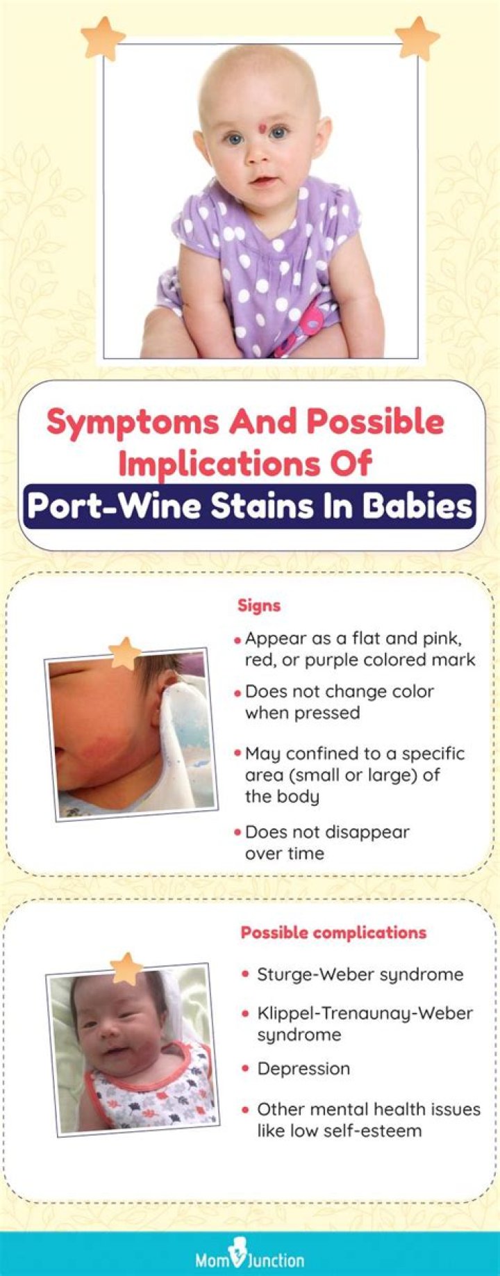 Port wine stains (also known as capillary malformations) are permanent red or blue-coloured birthmarks that are present from birth. They are quite common and happen in an estimated three out of 1000 babies. Some port wine stains are small, others can be quite large.When should I worry about port-wine stain?