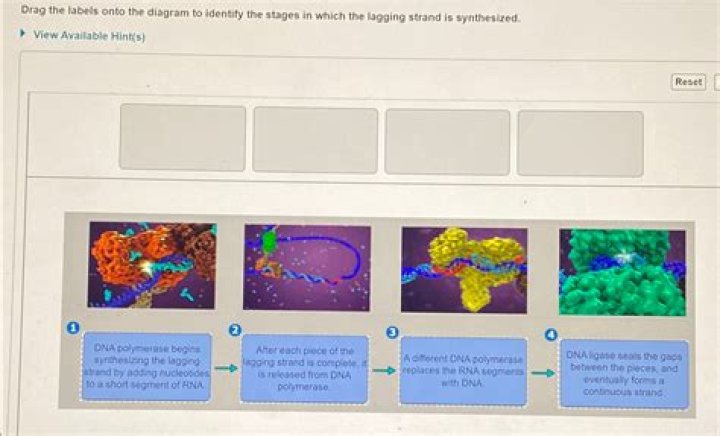 Within each fork, one DNA strand, called the leading strand, is replicated continuously in the same direction as the moving fork, while the other (lagging) strand is replicated in the opposite direction in the form of short Okazaki fragments.Which strand of DNA is lagging?