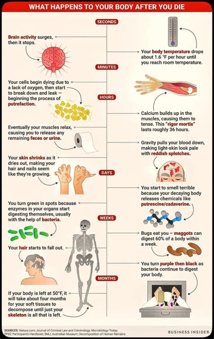 8-10 days postmortem: the body turns from green to red as blood decomposes and gases accumulate. 2+ weeks postmortem: teeth and nails fall out. 1+ month postmortem: the corpse begins to liquefy into a dark sludge.Is it painful when the soul leaves the body?
