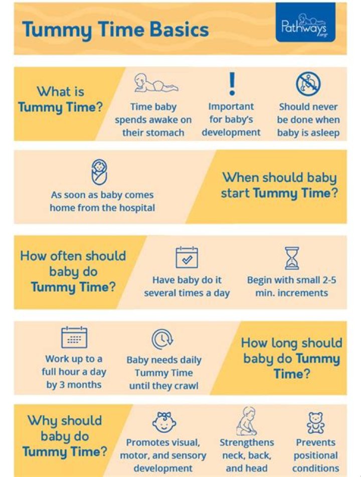 Always stay with your baby during tummy time. Always place babies on their backs (never on their bellies) to sleep to help prevent SIDS (sudden infant death syndrome). Do tummy time on a low, safe surface. Don't put your baby on a sofa or bed, where they could roll off or suffocate on pillows or a soft surface.