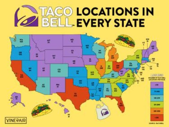 But a store location in Pacifica, California, takes the fast-food chain to a new level. It sits on a beach, takes orders at a walk-up window, and has an oceanfront patio where guests can enjoy their Doritos Locos Tacos. In 2013, Thrillist dubbed it "the greatest Taco Bell in the world."What state has the least Taco Bell?