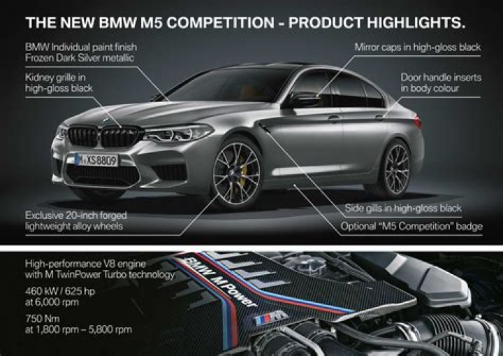 As of 2022, the M5 CS is the most powerful car in BMW M division's history and features a twin-turbocharged 4.4-liter V8 engine uprated to produce 635 horsepower and 553 lb-ft of torque.