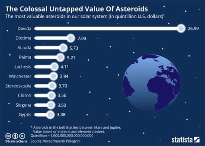 The most valuable asteroid in the belt is Davida. It has a diameter of 326 kilometres and has a resource value of almost $27 quintillion.