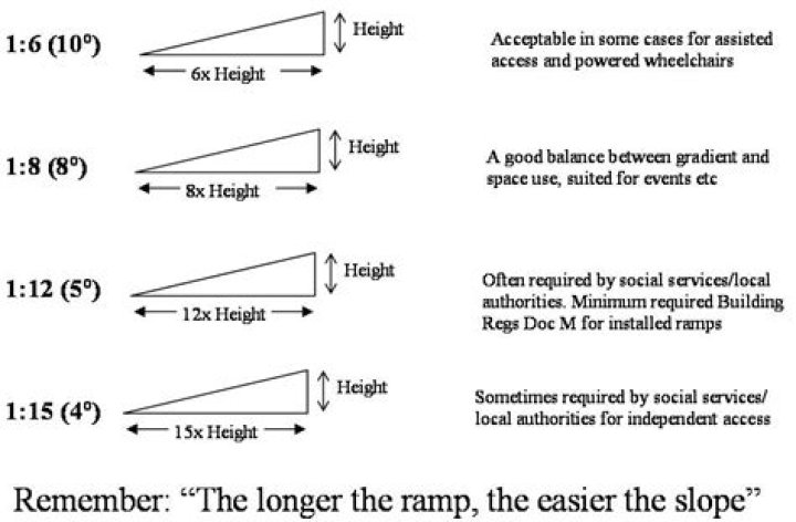 Maximum slope for hand-propelled wheelchair ramps should be 1" of rise to every 12" of length (4.8 degree angle; 8.3% grade). Maximum slope for power chairs should be 1.5" rise to 12" length (7.1 degree angle; 12.5% grade). Minimum width should be 36" (inside rails) - (48" is ideal).What is the maximum slope a car can drive on?