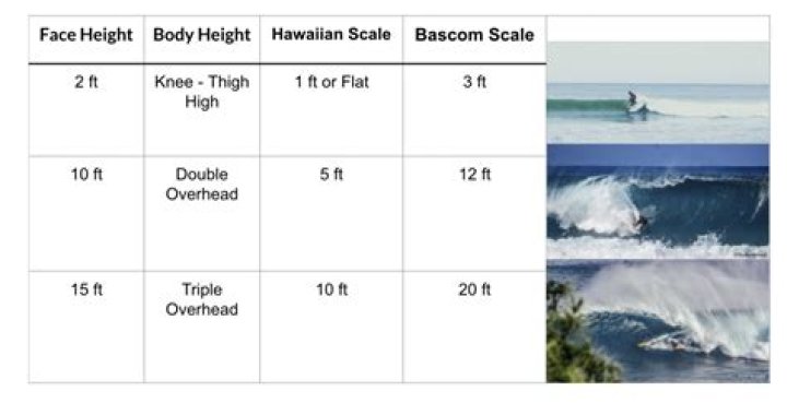 Here's the simplified wave face scale and the corresponding body height: 1 ft = Ankle-high. 2 ft = Knee-high.