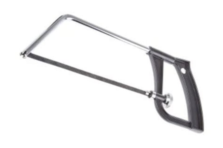 A hacksaw is a hand-powered, small-toothed saw used for cutting metal pipes, rods, brackets, etc. Hacksaws can also cut through plastic. The hacksaw has a U-shaped frame and a handle at one end. Hacksaws have small pins at each end of the frame that receive a blade.
