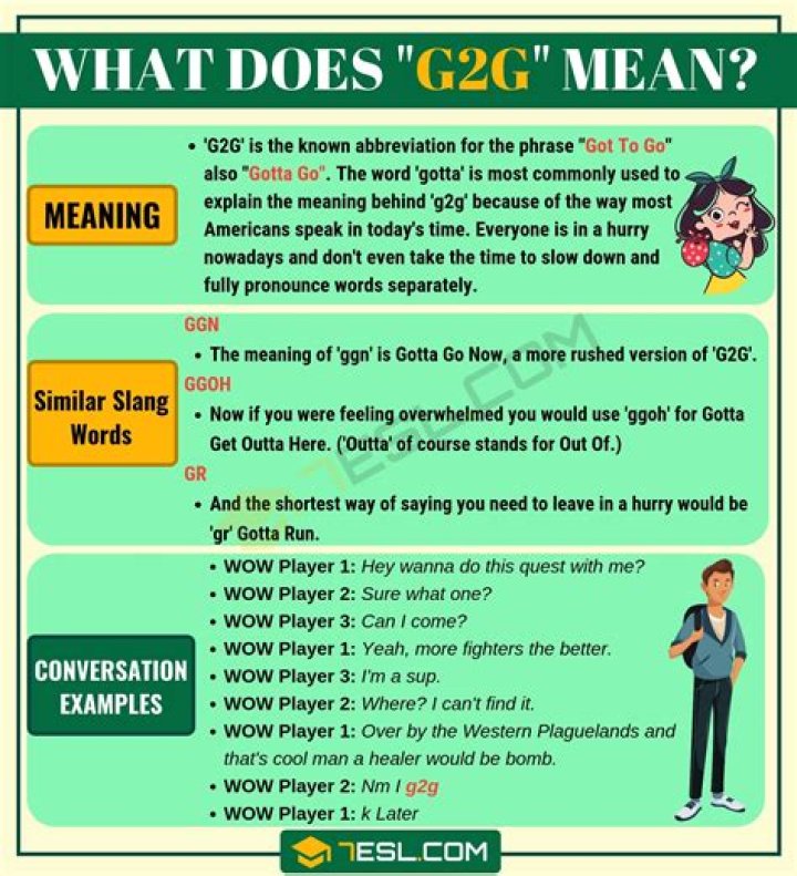 On the internet, the term G2G means “got to go” or “gotta go. “The line is left in instant messaging, email, or text messaging when a recipient needs to leave the conversation immediately.What does G2G mean in Urban Dictionary?