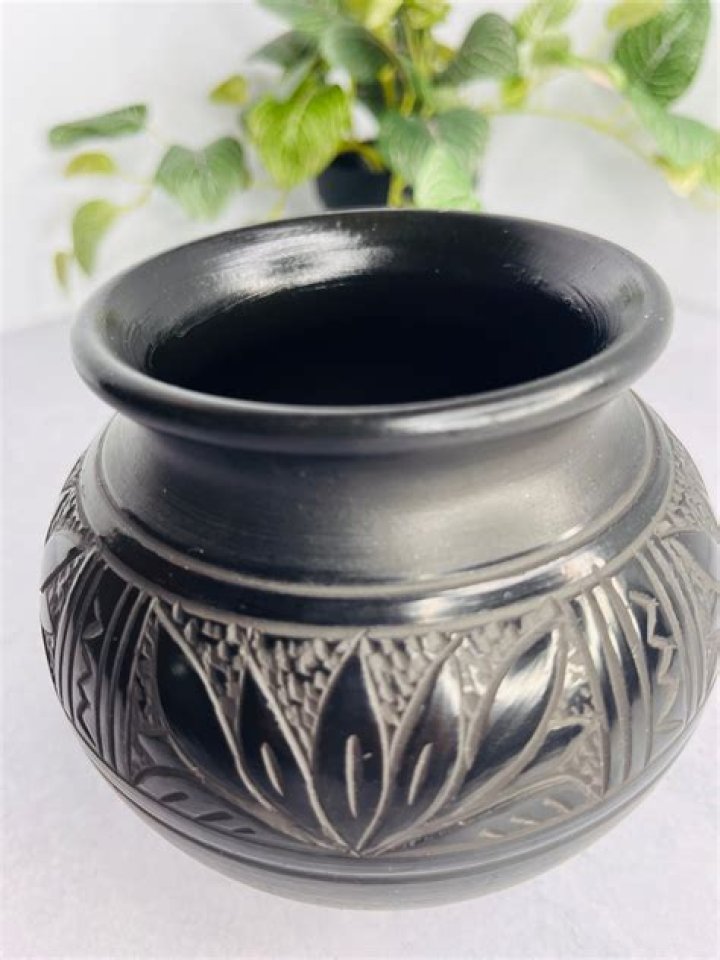 Santa Clara pottery is known for its distinctive glossy black or red finishes. To achieve blackware, the potters fire polished vessels in a smothered fire (i.e., a fire with less oxygenation). This firing technique turns the clay of the entire pot black.