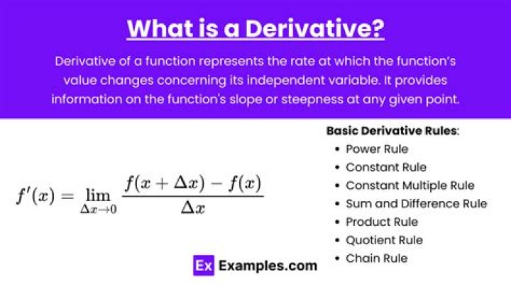 derivative, in mathematics, the rate of change of a function with respect to a variable. Derivatives are fundamental to the solution of problems in calculus and differential equations.What is a derivative in simple terms?